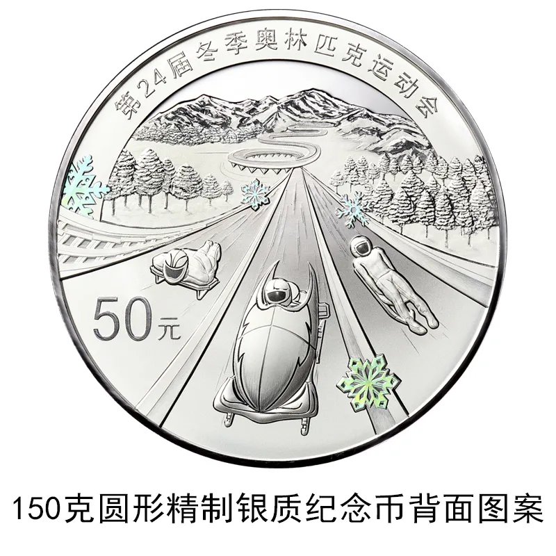 150克圆形银质纪念币背面图案为冬季奥林匹克运动会运动项目——钢架雪车、雪车、雪橇等运动造型,衬以国家雪车雪橇中心赛道、雪花等元素组合设计,并刊“第24届冬季奥林匹克运动会”字样及面额。