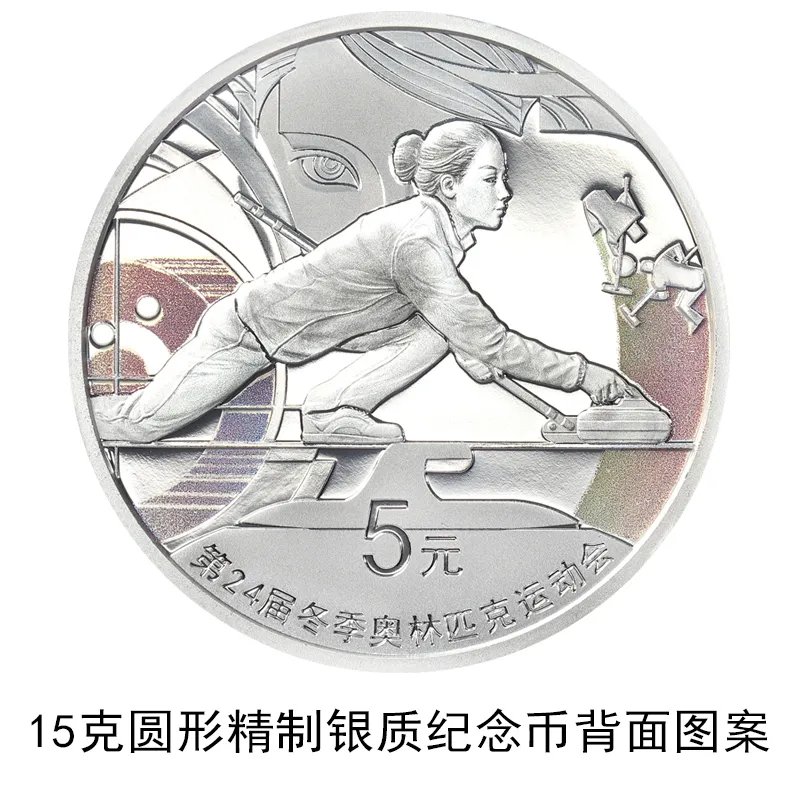 15克圆形银质纪念币背面图案为冬季奥林匹克运动会运动项目——冰壶运动造型,衬以装饰风格的运动竞技场景等元素组合设计,并刊“第24届冬季奥林匹克运动会”字样及面额。