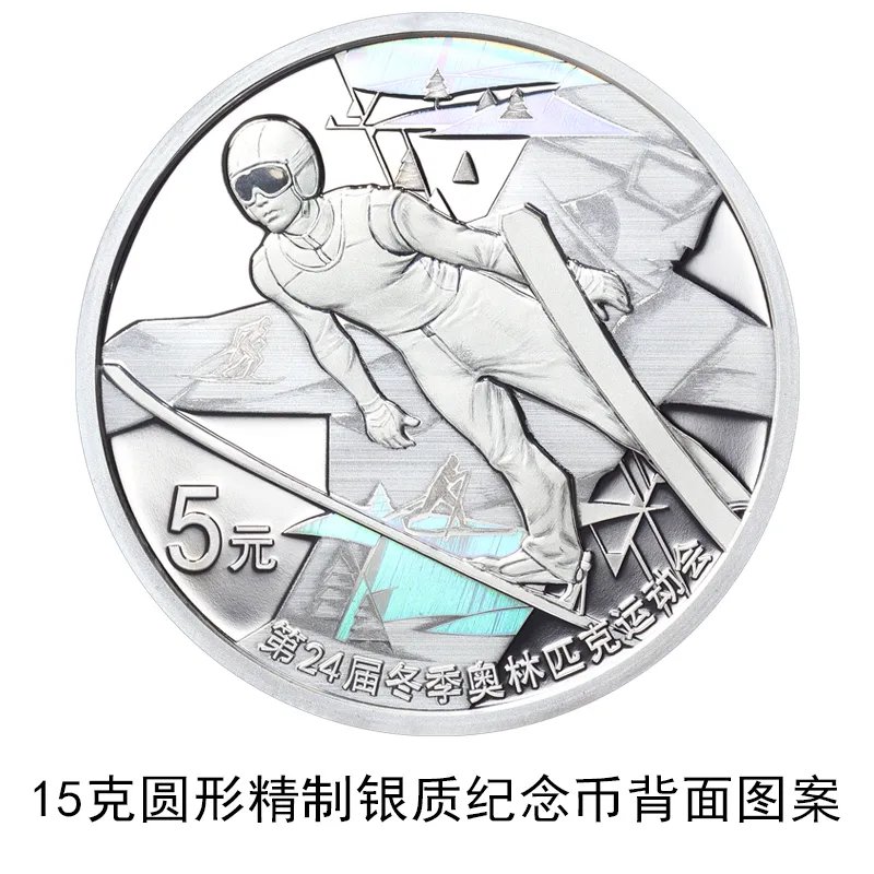 15克圆形银质纪念币背面图案为冬季奥林匹克运动会运动项目——北欧两项运动造型,衬以装饰风格的运动竞技场景等元素组合设计,并刊“第24届冬季奥林匹克运动会”字样及面额。