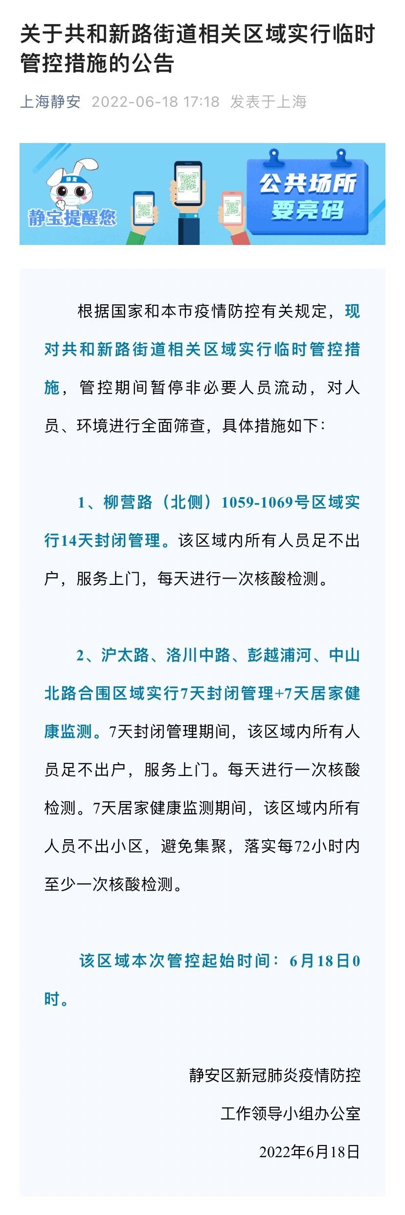 根据国家和本市疫情防控有关规定,现对共和新路街道相关区域实行临时管控措施,管控期间暂停非必要人员流动,对人员、环境进行全面筛查,具体措施如下: