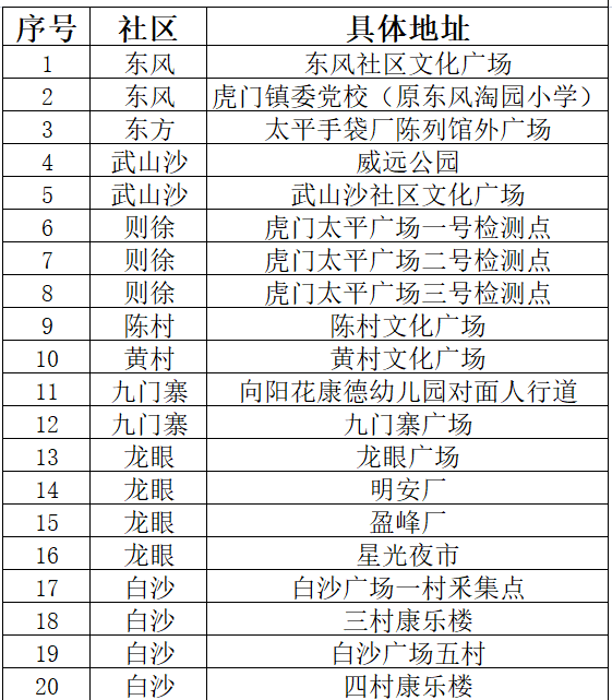 一、检测区域:东风、东方、武山沙、则徐、陈村、黄村、九门寨、龙眼、白沙、小捷滘、新湾、镇口、路东、南栅、沙角、宴岗、南面、北面等18个社区。