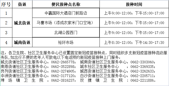 江城区5月26日新冠疫苗便民接种服务点安排如下: