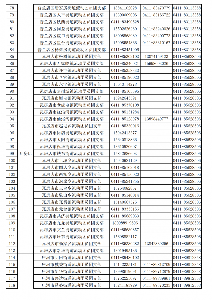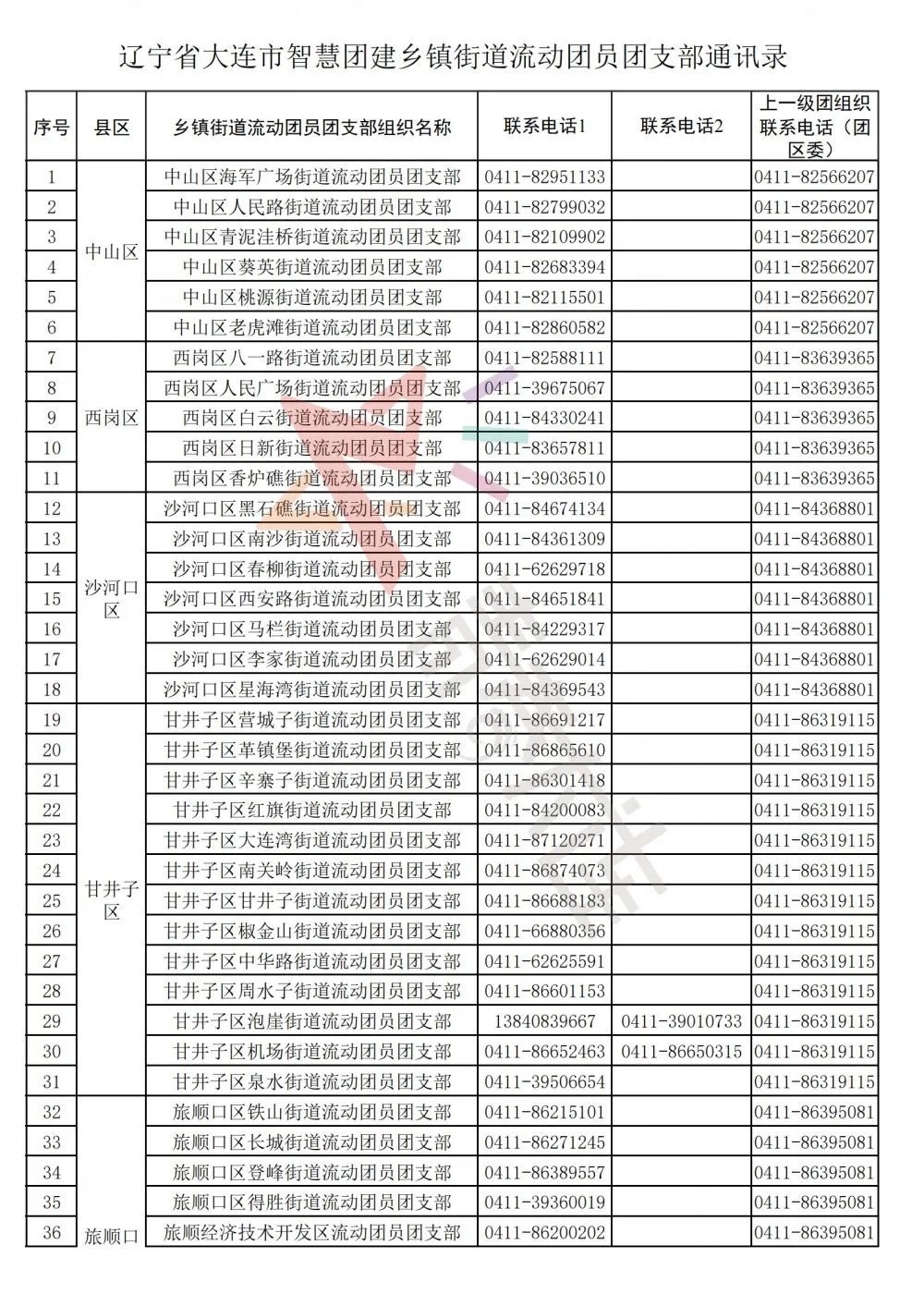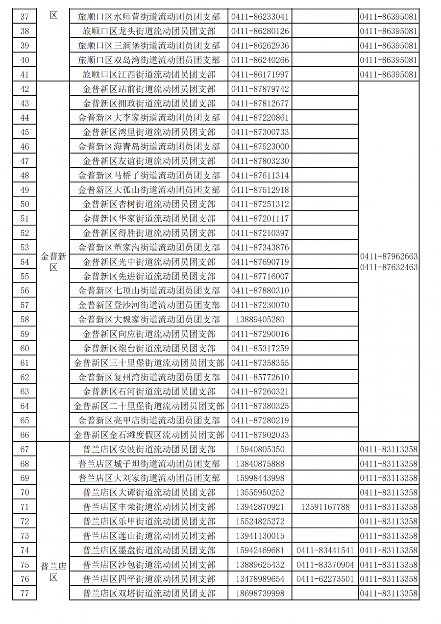 大连市各区市县(先导区)乡镇街道流动团员支部通讯录