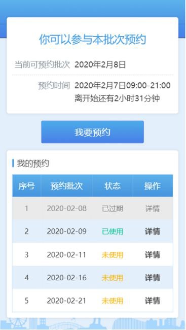 ⑤ 验证成功后,转入预约页面,显示预约批次、时间和是否具备预约资格(5日内是否已成功预约过),点击“我要预约”