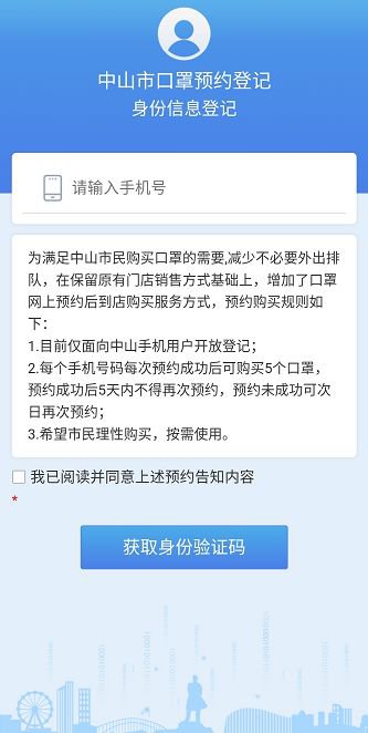 ① 进入预约系统http://kz.yq.zszwfw.cn/kzyy-register/,点击菜单栏的“预约口罩”,先点击“身份登记”获取身份验证码,只需登记一次,此后可按规则参与预约,不用重复登记。