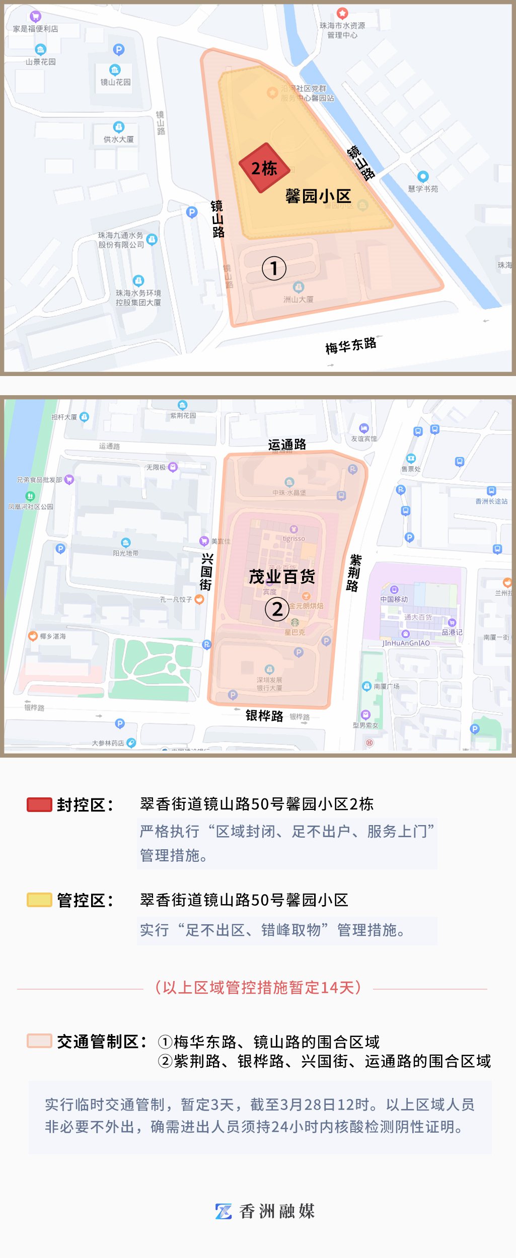 对梅华东路、镜山路的围合区域,紫荆路、银桦路、兴国街、运通路的围合区域进行临时交通管制,暂定3天,截至3月28日12时。以上区域人员非必要不外出,确需进出人员须持24小时内核酸检测阴性证明。
