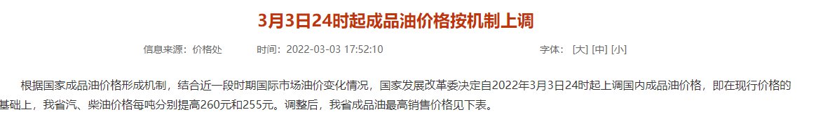 ➤油价调整时间:3月3日24时起成品油价格按机制上调