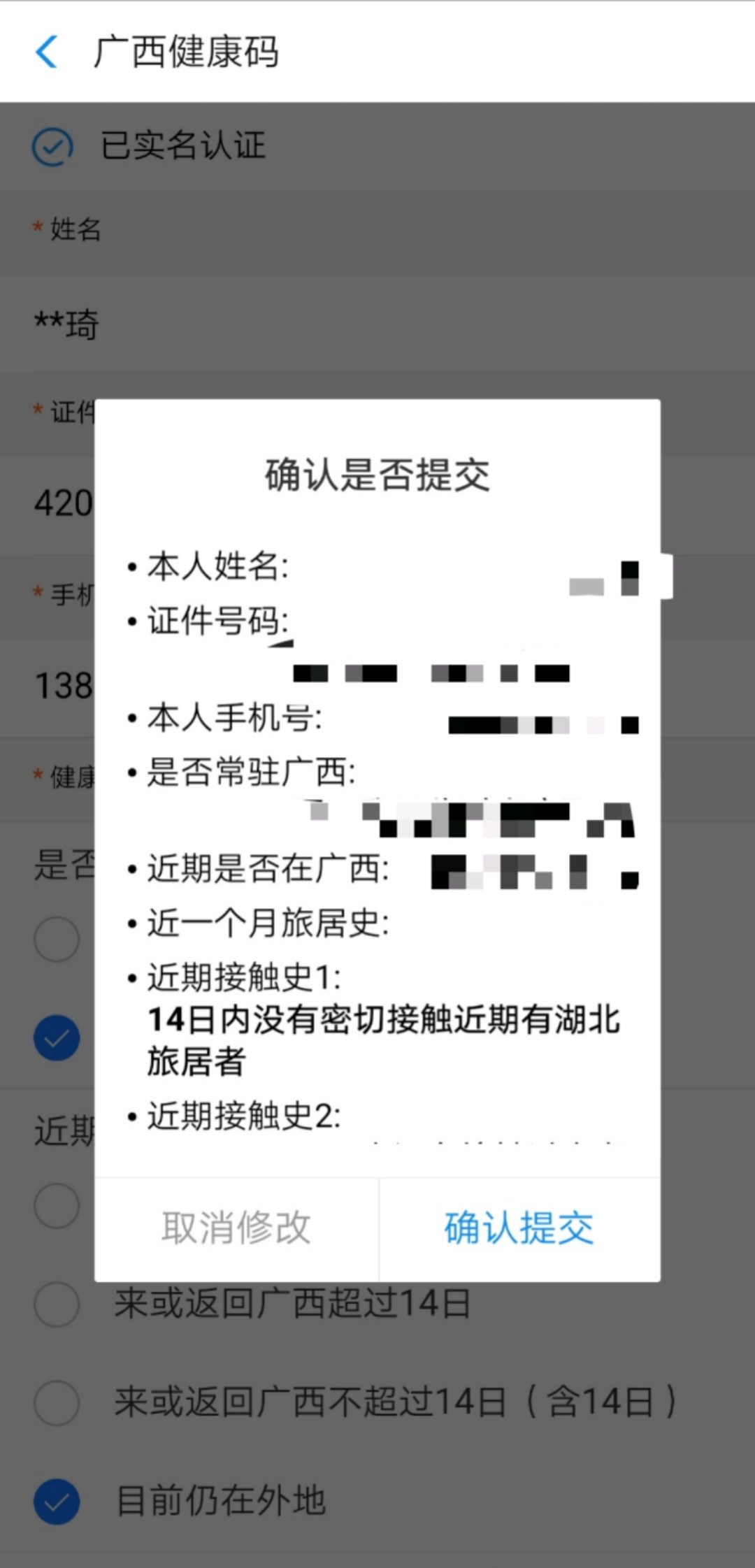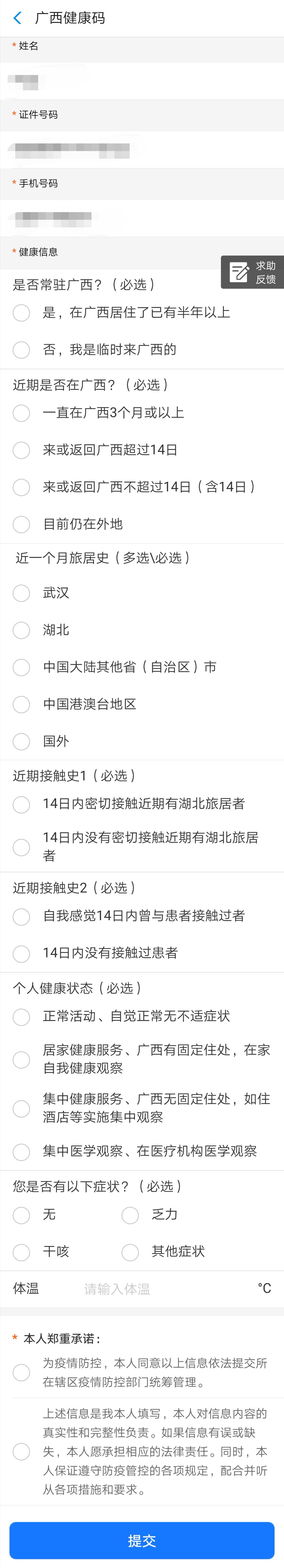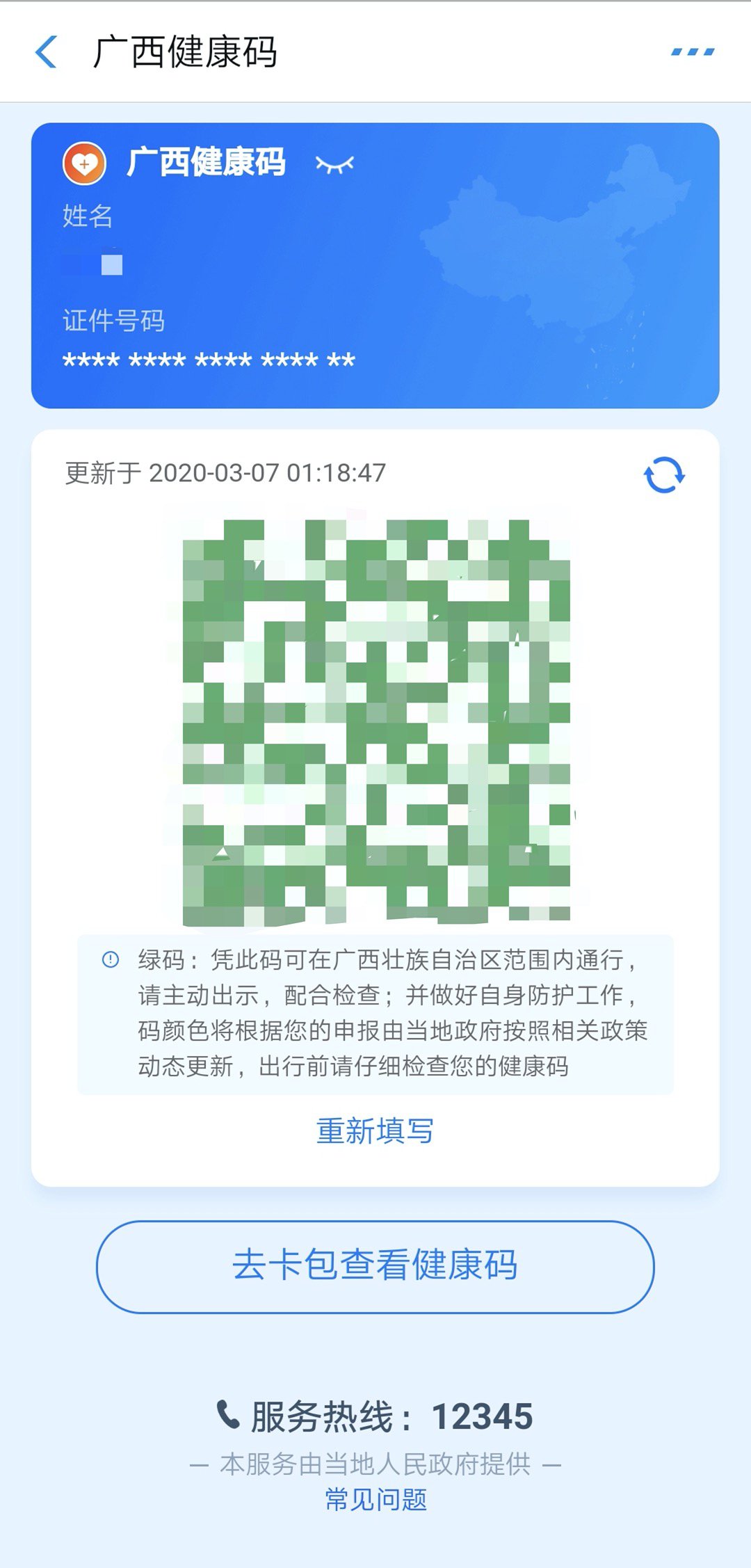 1、广西健康码采取“多平台、多入口、一人一码一体验”的机制,不同平台领取到的健康码都是一样的,一码通用。