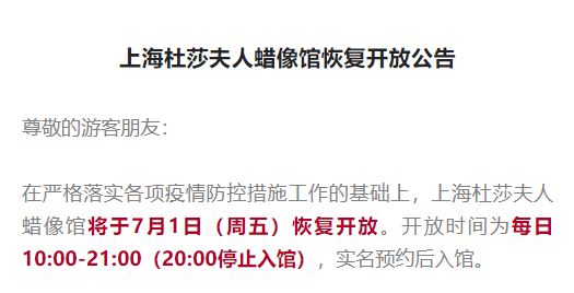 上海杜莎夫人蜡像馆恢复开放公告