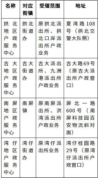 2018年5月2日起,珠海市公安局拱北口岸分局整体回归以“一镇街一办理点”为设置原则的相关业务受理模式,将辖区拱北派出所、拱北口岸派出所、吉大派出所、南屏派出所、九洲港派出所、湾仔派出所、洪湾派出所的户籍、居住证业务分别统一到拱北、吉大、南屏、湾仔四个户政服务中心办理。明确各户政服务中心的日常工作由分局治安大队统一管理,这些户政服务中心有些设在派出所院内,有些则是独立设置。上述派出所不再直接受理户籍、居住证业务。