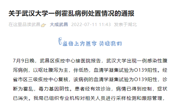 关于武汉大学一例霍乱病例处置情况的通报