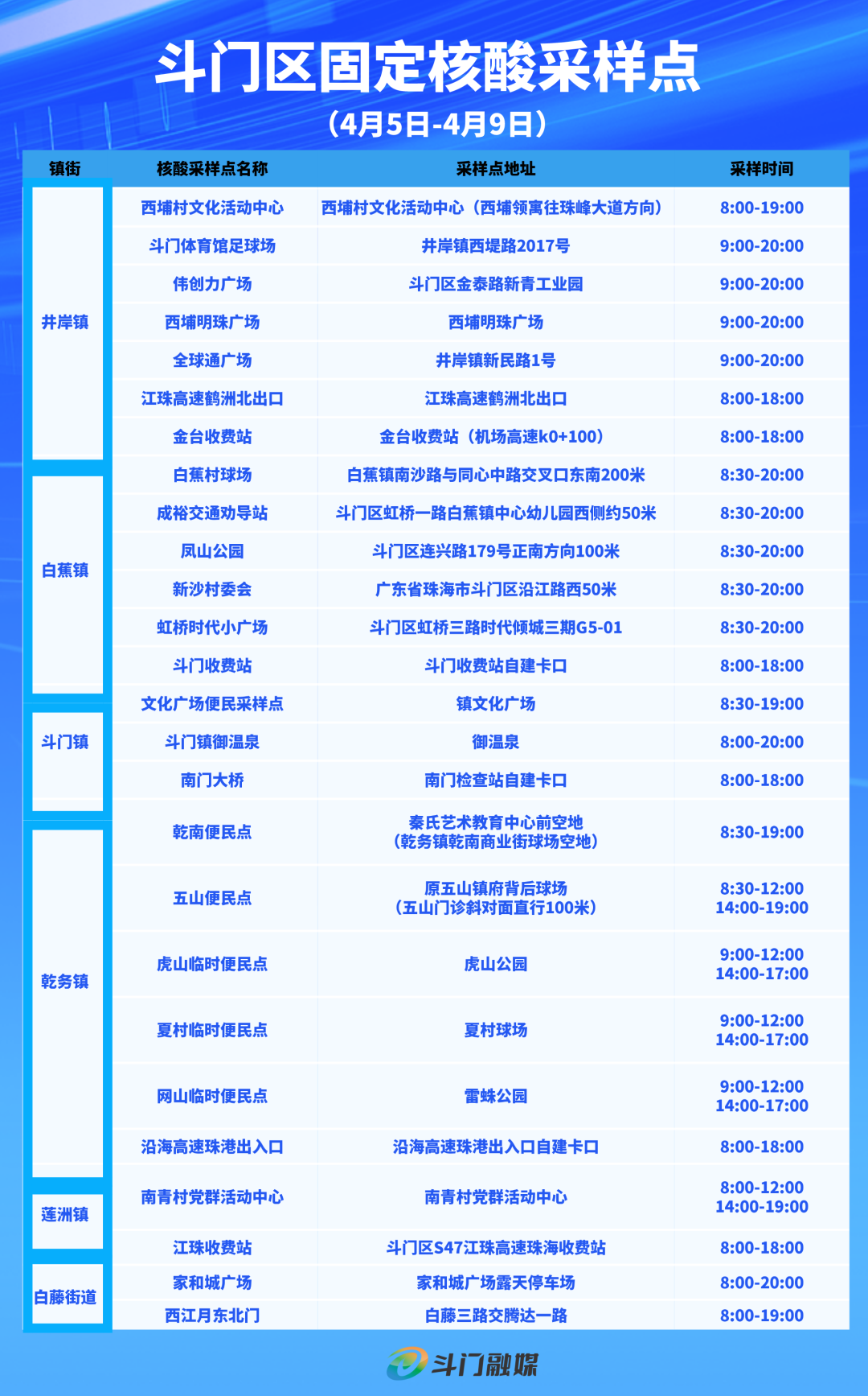4月5日至4月9日,斗门将继续推进分布式预警核酸筛查,设置26个固定便民核酸采样点,为市民提供免费核酸采样服务,采样点覆盖五镇一街。