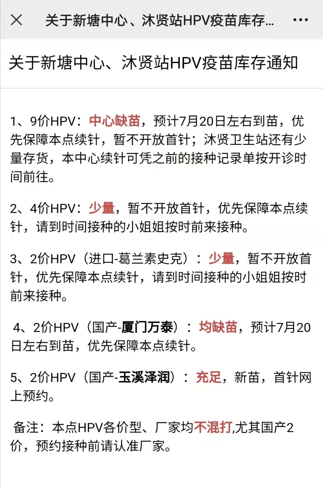新塘中心、沐贤站HPV疫苗库存通知(7月11日公布)