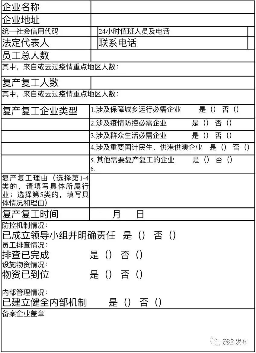茂名企业复产复工备案表样式