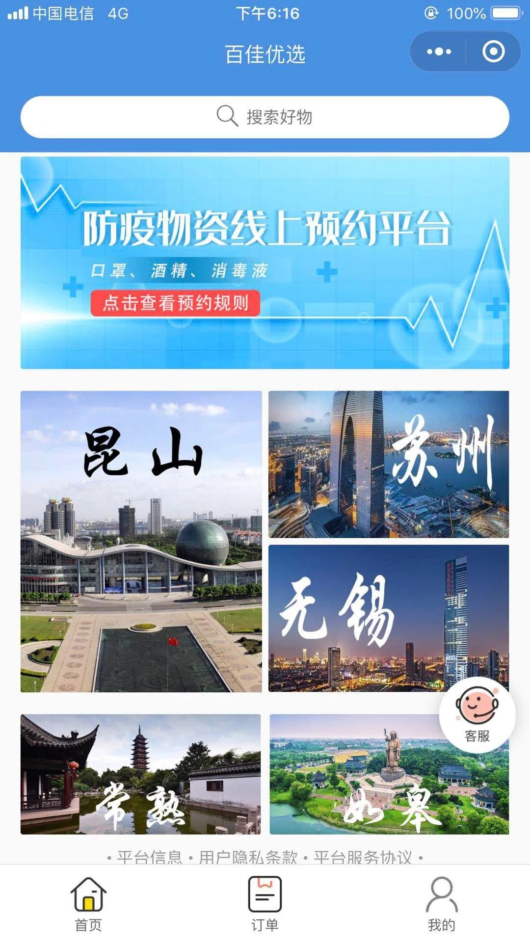 为满足江苏市民购买口罩的需求,解决市民买口罩难的问题,2020年2月25日起开放试运行百佳惠大药房预约购买系统,为广大市民群众提供线上预约购买战“疫”用品服务;将在昆山、苏州、常熟、如皋、江阴、无锡等地供应一次性口罩,让市民放心安心购买。按照公平、公正、公开原则,每位预约下单成功市民可购买口罩1包。