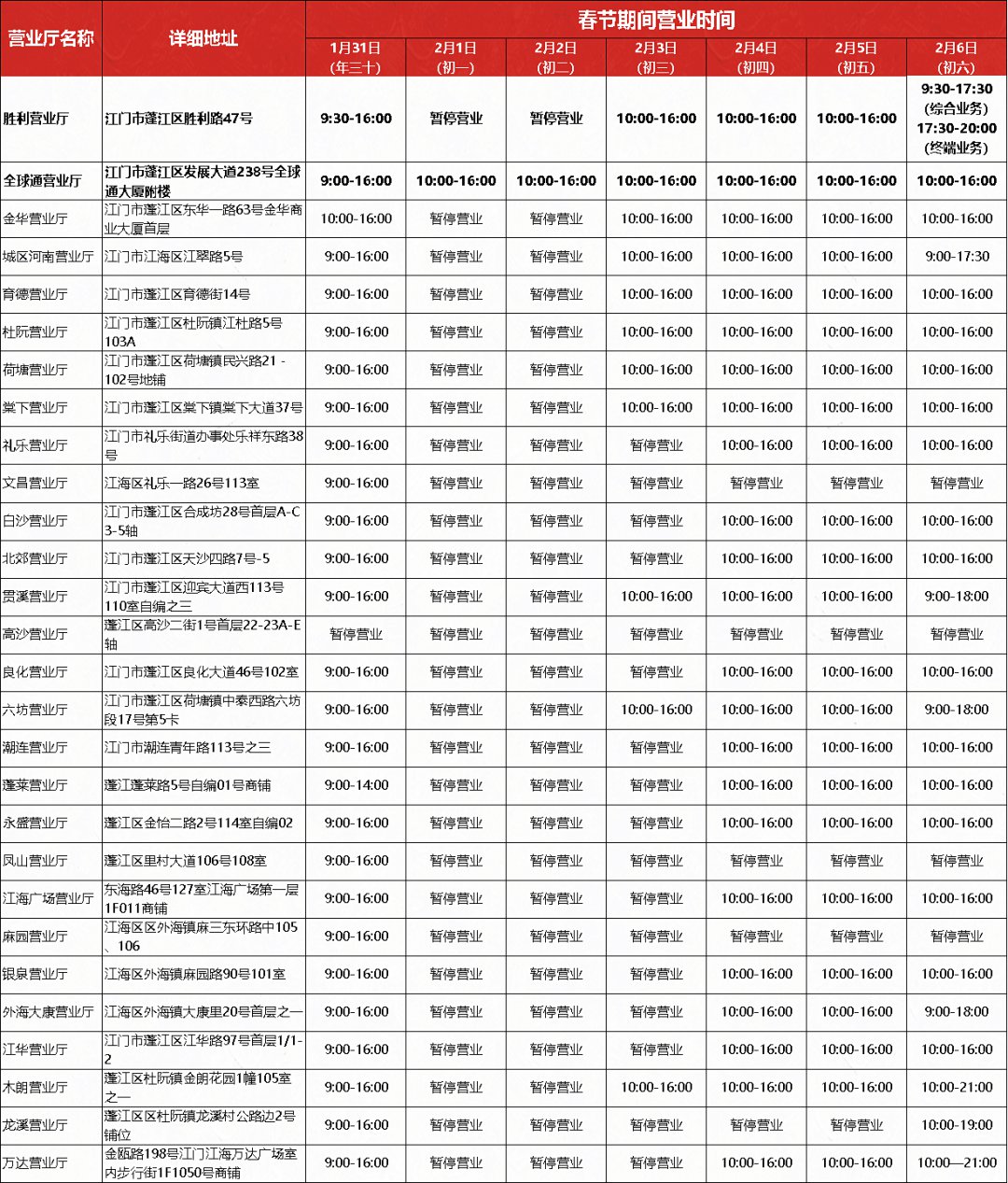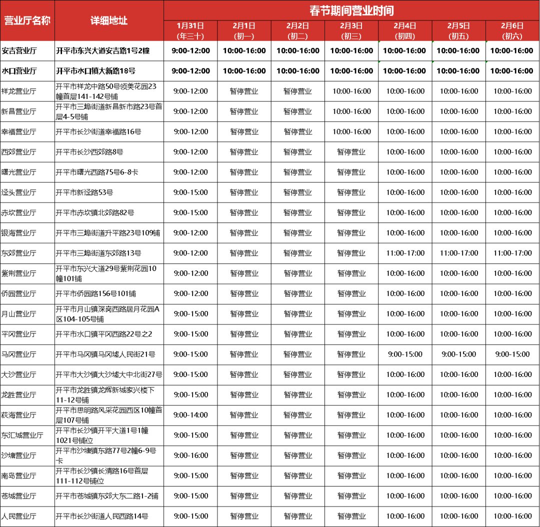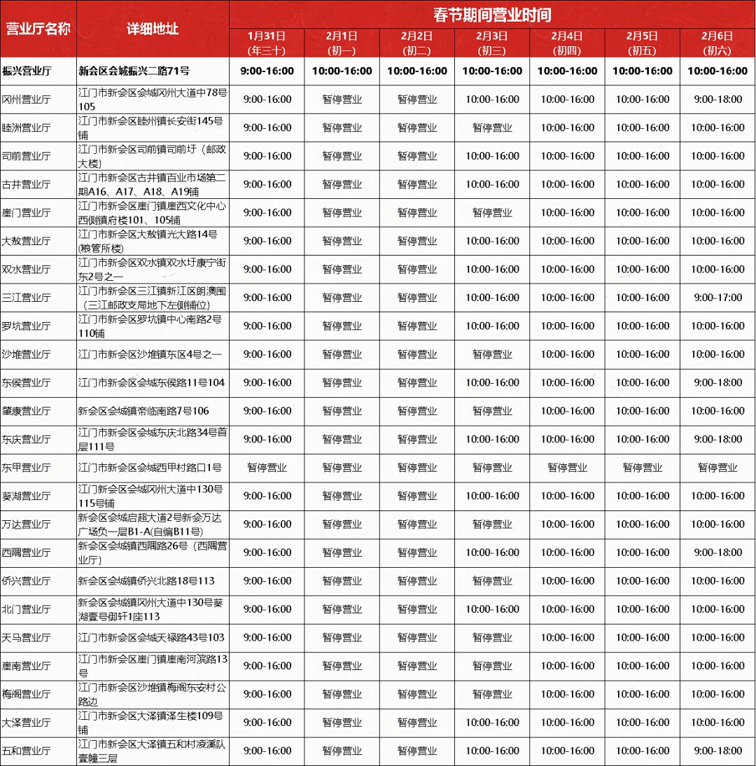 春节期间(年二十九至初六,1月31日至2月6日)将会临时调整营业时间,部分营业厅将暂停对外办理业务,2月7日起全部恢复正常营业时间。