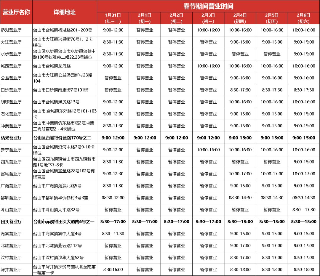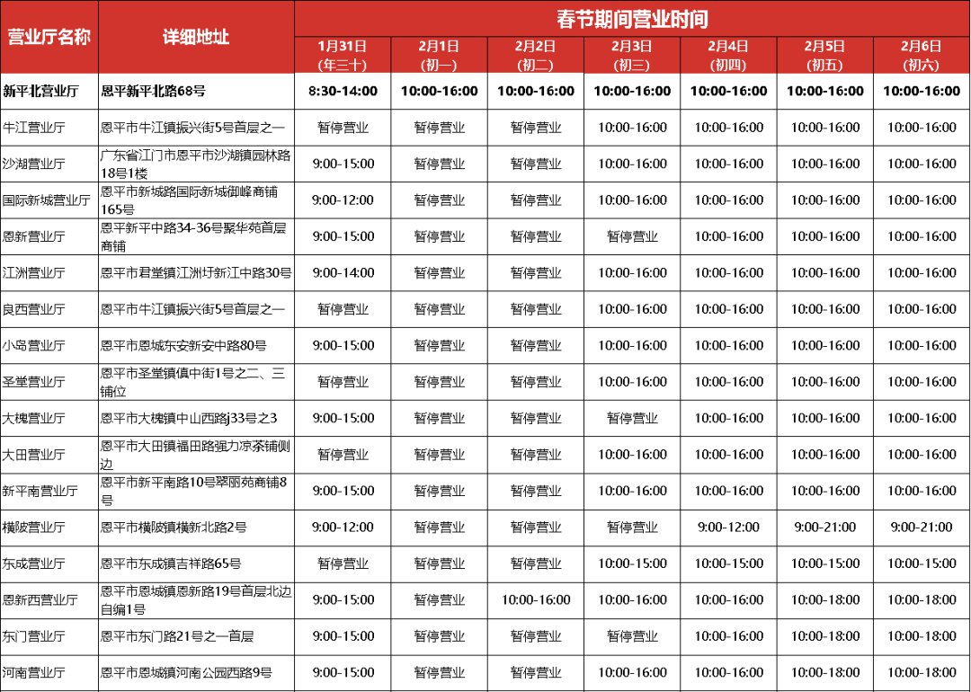 具体调整的营业时间请上下滑动查看下图,各营业厅实际营业时间最终以营业厅对外公告为准。