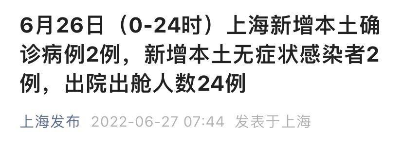 上海市卫健委6月27日通报:2022年6月26日0—24时,新增本土新冠肺炎确诊病例2例和无症状感染者2例,其中2例确诊病例在隔离管控中发现,详情如下。