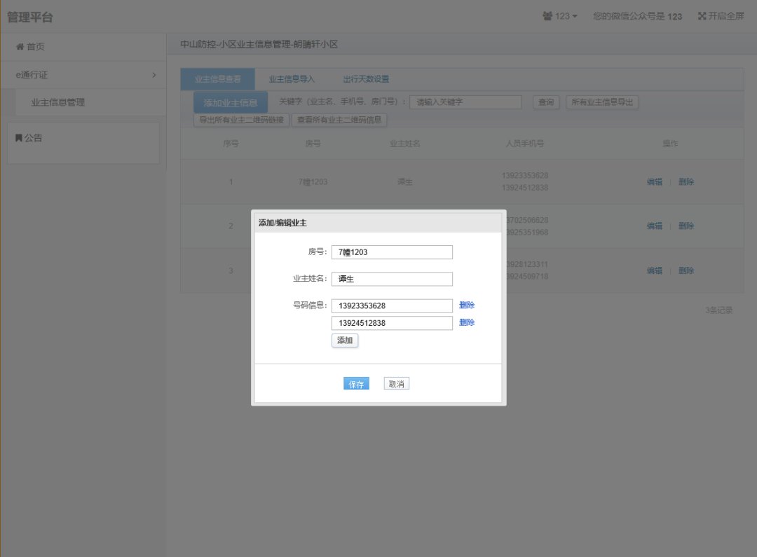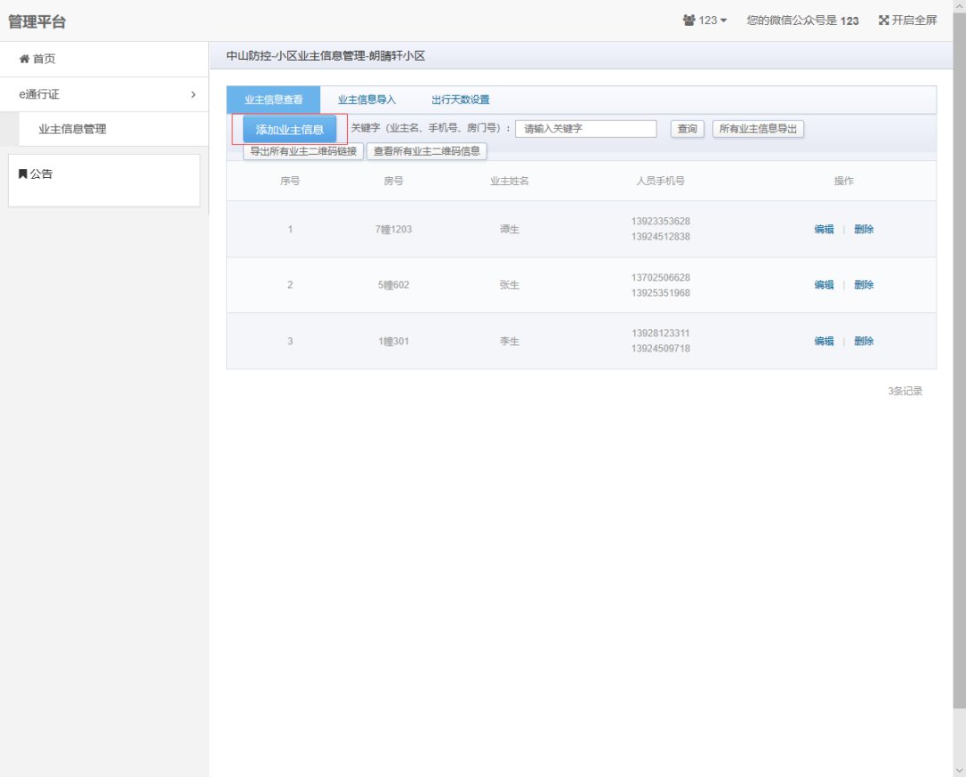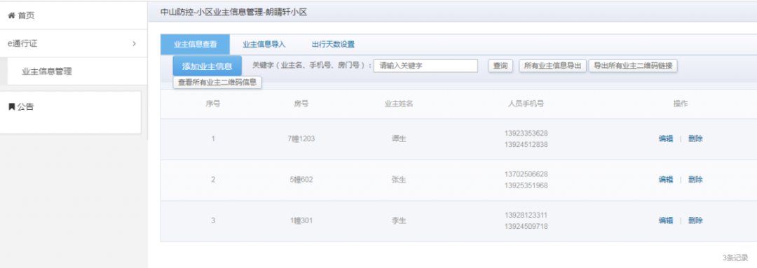 小区管理人员登录后e通行证功能界面如下图