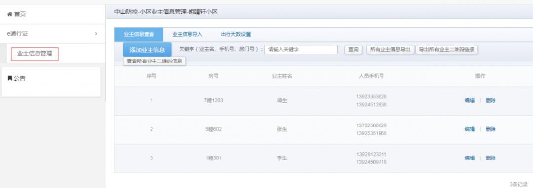 在“业主信息管理”界面,点击“查看所有业主二维码信息”即可查看所有居住人员的电子通行证,可将通行证打印分派给居住人员: