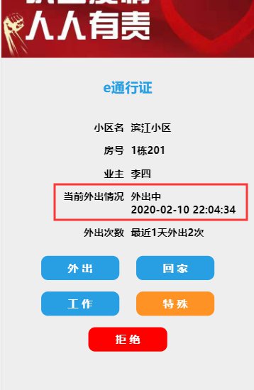 1) 居住人员外出时,小区管理人员提示居住人员提供E通行证二维码或纸质的E通行证二维码。