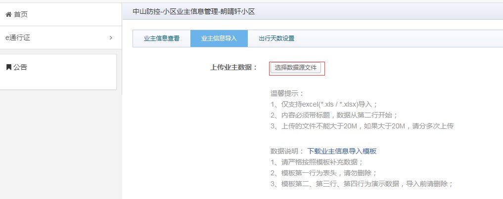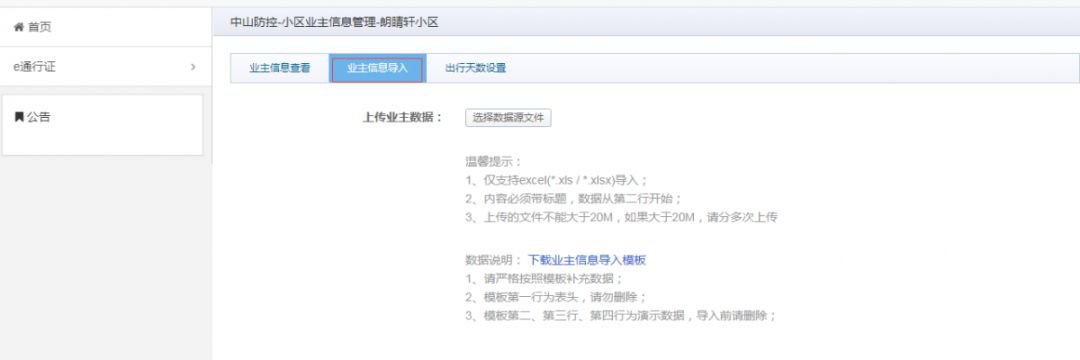 也可使用excel文档批量导入居住人员信息。点击“业主信息导入”,进入居住人员数据导入界面,如下图: