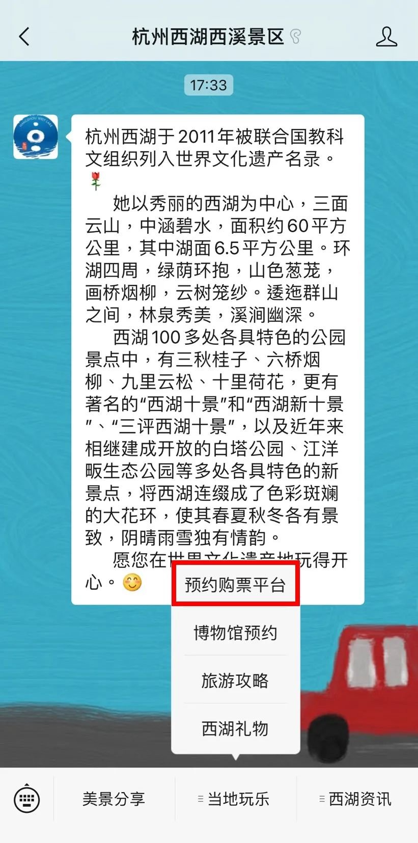 一、关注“杭州西湖西溪景区”或者“西湖旅游”官方公众号,点击菜单栏“当地玩乐”→“预约购票平台”;