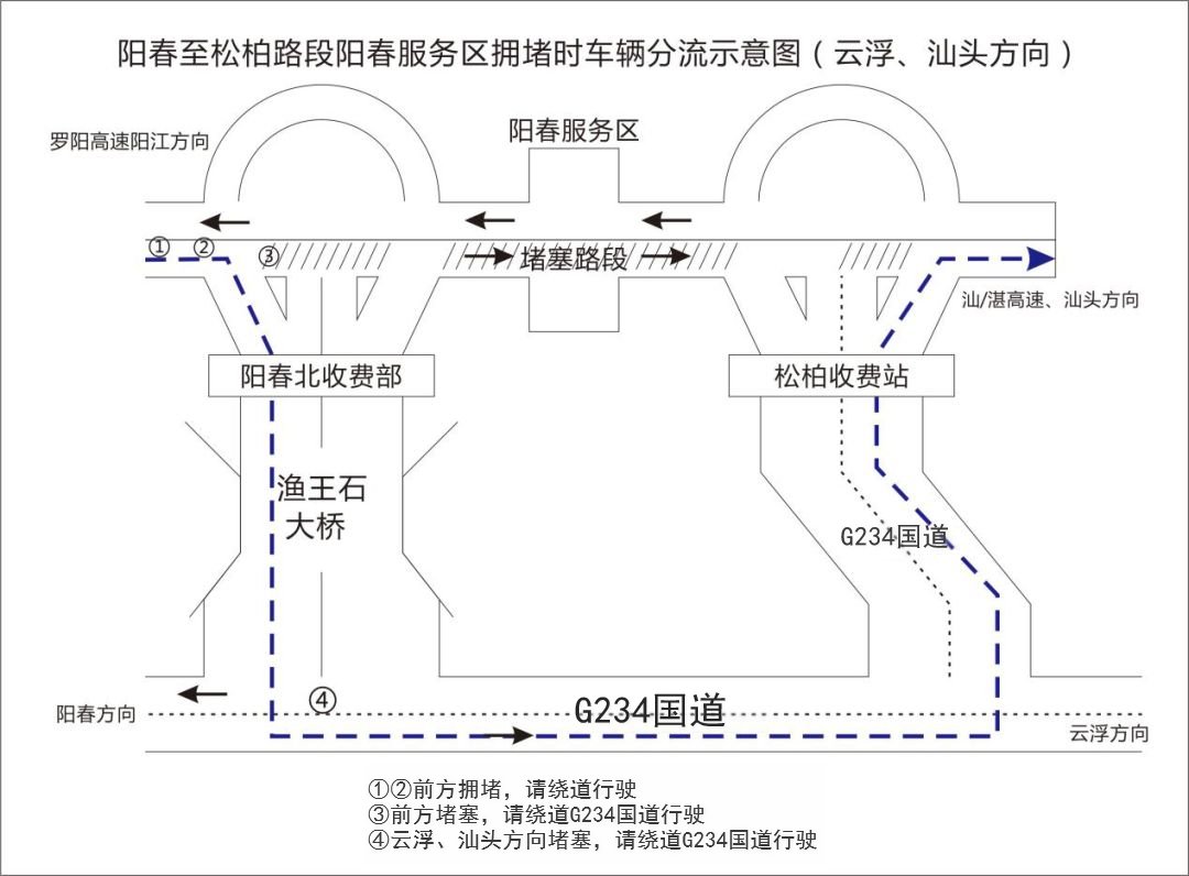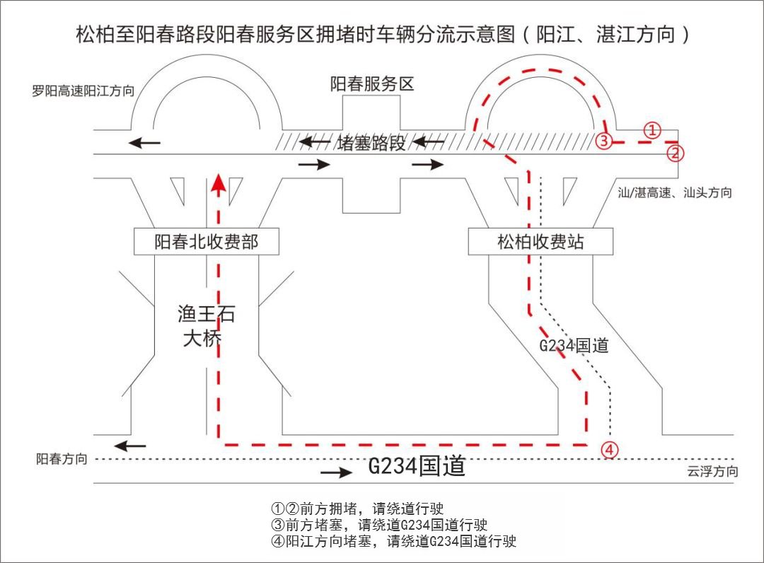 节前:在开春高速公路、合水收费站至南星互通路段发生拥堵时,开平往阳春方向的车辆推荐由合水收费站出口下高速→234国道→鱼王石大道→阳春北收费站入口→汕湛高速。