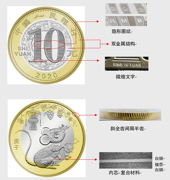 硬币外环为黄铜合金,内芯为具有独特机读性能的镍带复合白铜材料。