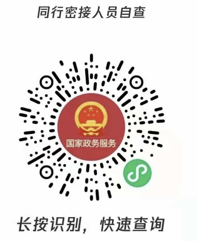 通过微信搜索进入国家政务服务平台小程序或长按识别以下小程序代码,即可进入同行密切接触人员自查服务。