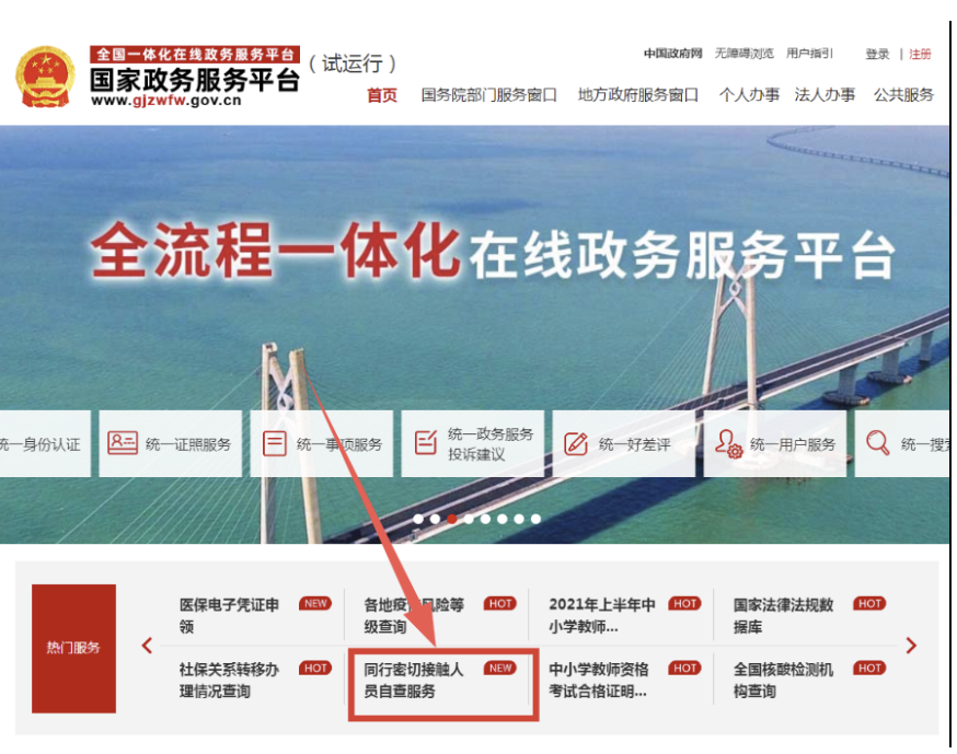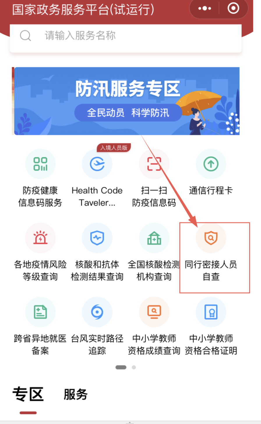 点击国家政务服务平台小程序进入同行密接人员自查