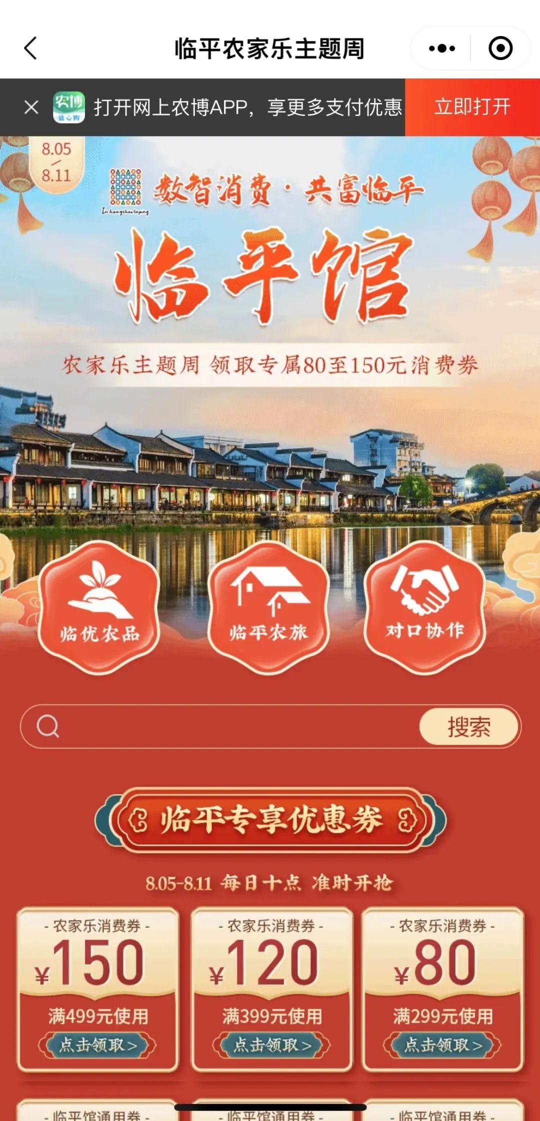 1、微信小程序搜索“网上农博”进入“网上农博”小程序首页,点击“市县馆”→“临平区”即可进入“临平专属优惠券”领取页面。