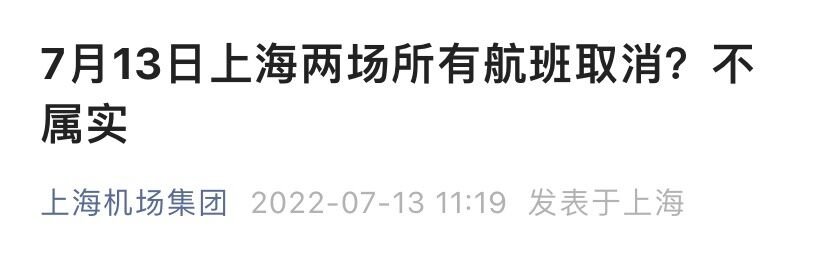 2022年7月13日,上海机场集团发布情况说明:网传“13日零时起,上海浦东机场和虹桥机场八成以上航班将调减取消,11:00后浦东机场所有航班取消,15:00后虹桥机场所有航班取消”,此消息不属实。