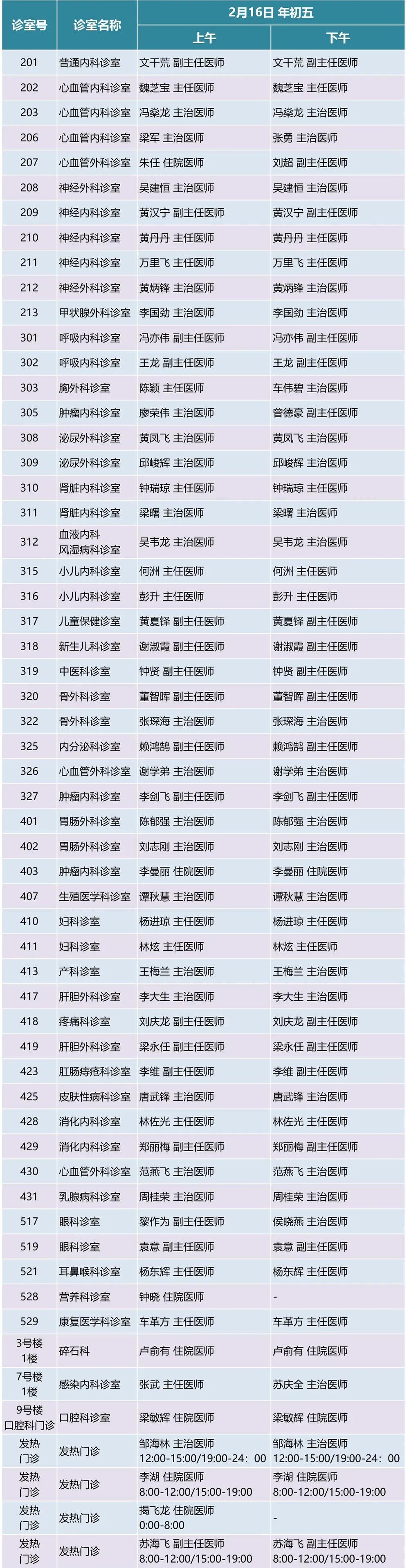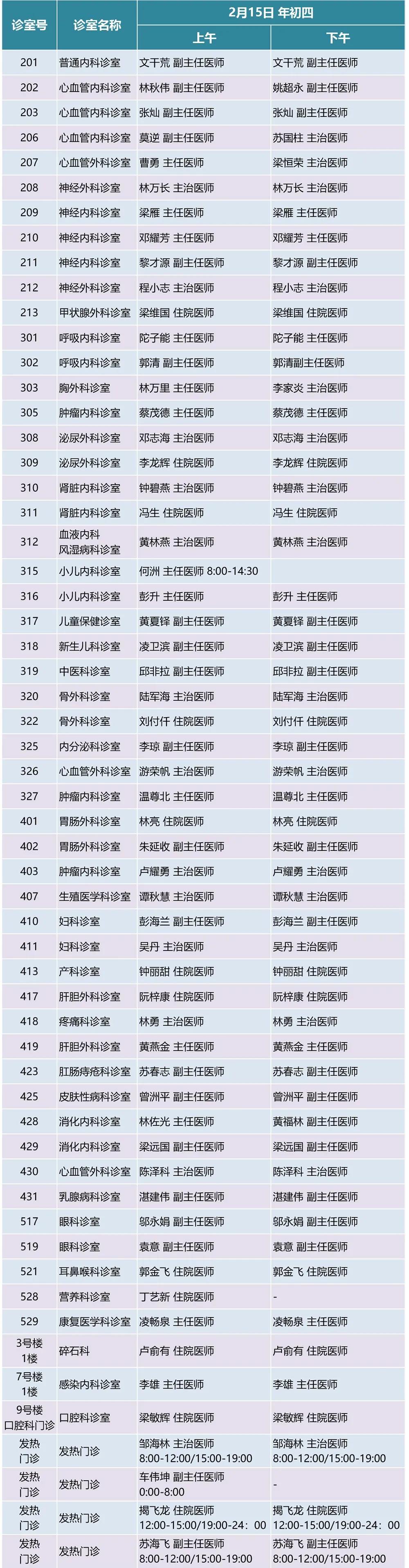 2月11日(除夕)下午、12日(年初一)、13日(年初二)、14日(年初三)部分科室出诊;