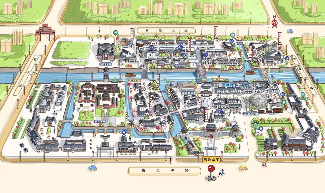 中国第一条人工古运河伯渎河穿境而过,被称为最纯粹的 “民俗风情水上图”,流淌着浓郁的吴文化气息,沿河风光带天水交融,梅花浜等水系贯通,游客身临其境寻梦江南,形成“古街文化景观,现代生活体验”的绝美水墨画