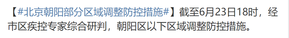 截至6月23日18时,经市区疾控专家综合研判,北京市朝阳区以下区域调整防控措施。
