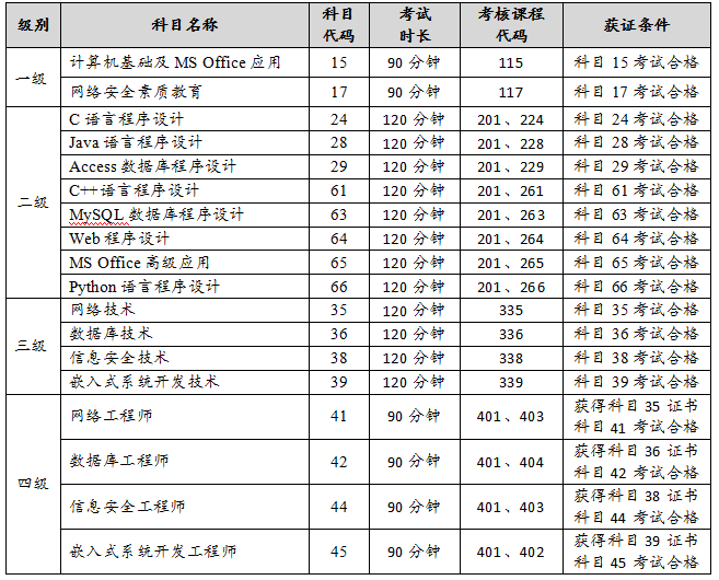 一级、三级科目的获证条件:只要科目成绩达到合格线,即可获得相应证书;二级语言类及数据库类科目(即MS Office高级应用以外的其他二级科目)获证条件为:总分达到60分且选择题得分达到50%(即20分)及以上的考生方可取得合格证书;四级科目的获证条件:四级科目成绩达到合格线,并已经(或同时)获得三级相关证书。