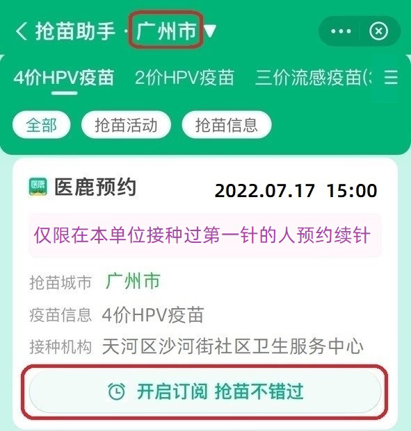 注:点击“开启订阅”,抢苗时间不错过!疫苗开放预约时,订阅按钮将变为预约入口,点击立即预约。