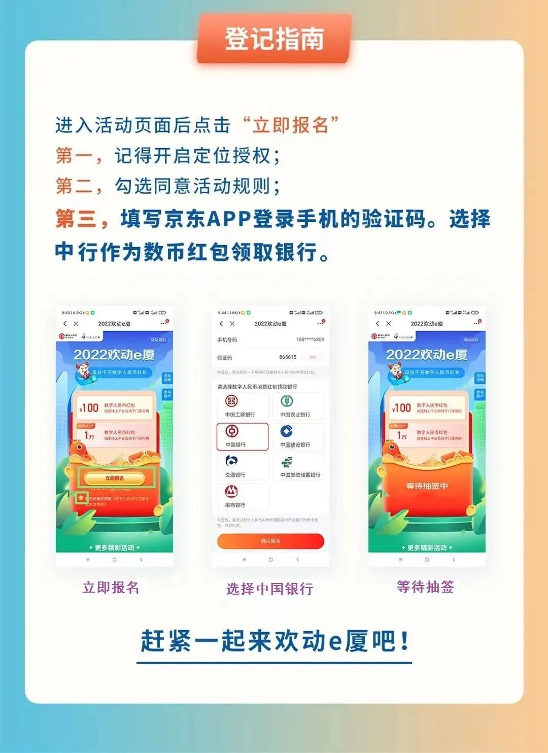 可通过京东App、“i厦门”App、云闪付App、7家数字人民币运营银行App,进入“2022欢动e厦”活动专区界面,根据活动参与攻略指引进行报名。