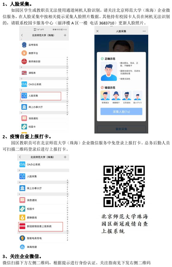 园区校外住宿学生:居住在珠海市内园区校外学生,返校需提供48小时核酸检测阴性证明申请返校。学生入校时须出示48小时内核酸检测阴性证明、粤康码、行程卡,检查无异常后,刷学生卡(实体卡)或人脸识别出入校。