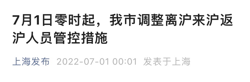 根据国务院联防联控机制《新型冠状病毒肺炎防控方案(第九版)》有关要求,上海市自2022年7月1日零时起,调整对来沪返沪人员管控措施,具体如下。