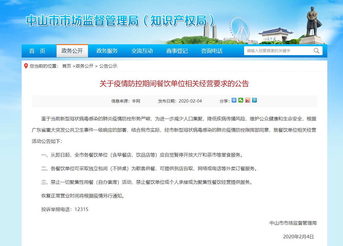 2月4日,中山市市场监督管理局发布《关于疫情防控期间餐饮单位相关经营要求的公告》,鉴于当前新型冠状病毒感染的肺炎疫情防控形势严峻,为进一步减少人口集聚,降低疾病传播风险,维护公众健康和生命安全,根据广东省重大突发公共卫生事件一级响应的部署,结合我市实际,经市新型冠状病毒感染的肺炎疫情防控指挥部同意,就餐饮单位相关经营活动公告如下: