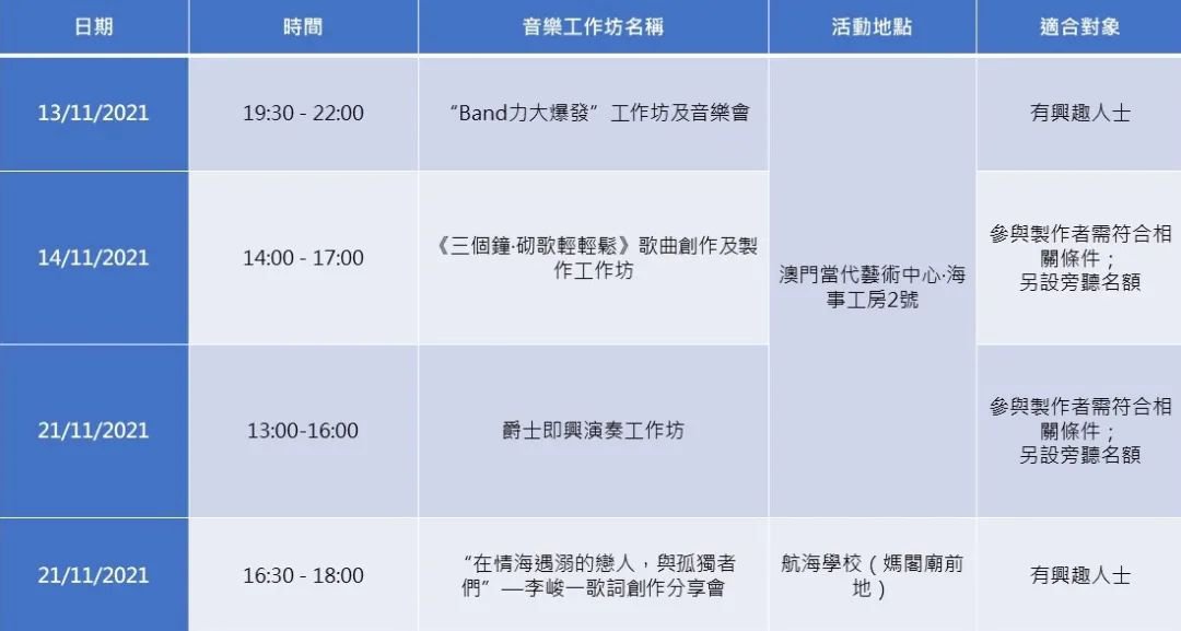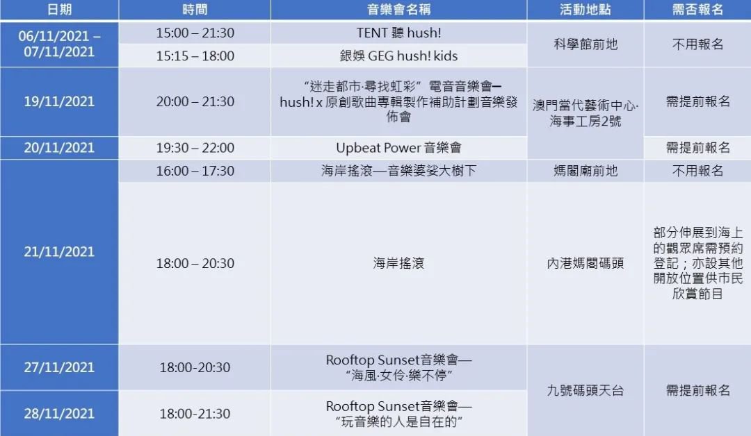 “hush! 2021音乐会”以“沿海的音乐盛会”为主题,喻意澳门作为临海城市,接纳来自世界各地的文化,孕育出澳门流行音乐的开放和多元性,创造独特的文化风景。欢迎大家一起来吹海风、听音乐,在天台上、在趸船上,伴随夕阳及繁星,欣赏澳门漂亮的音乐人文风景!