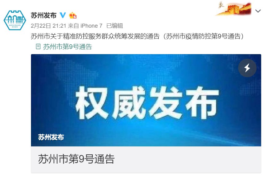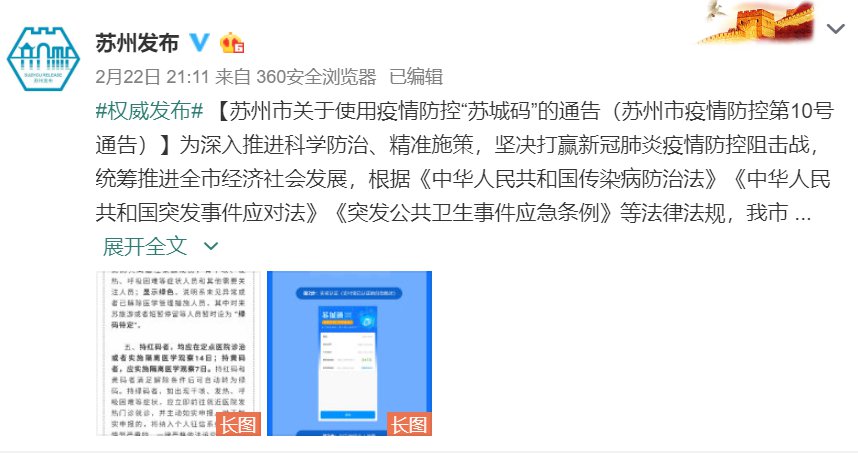根据苏州发布微博消息,2月22日晚,苏州市发布关于精准防控服务群众统筹发展的通告(苏州市疫情防控第9号通告)和关于使用疫情防控“苏城码”的通告(苏州市疫情防控第10号通告),决定从2020年2月22日起启用疫情防控“苏城码”。