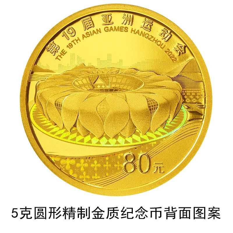 5克圆形金质纪念币背面图案为杭州奥林匹克体育中心体育场,辅以城市建筑、山水、桂花等元素装饰组合设计,并刊“第19届亚洲运动会”中文字样、“THE 19TH ASIAN GAMES HANGZHOU 2022”英文字样及面额。