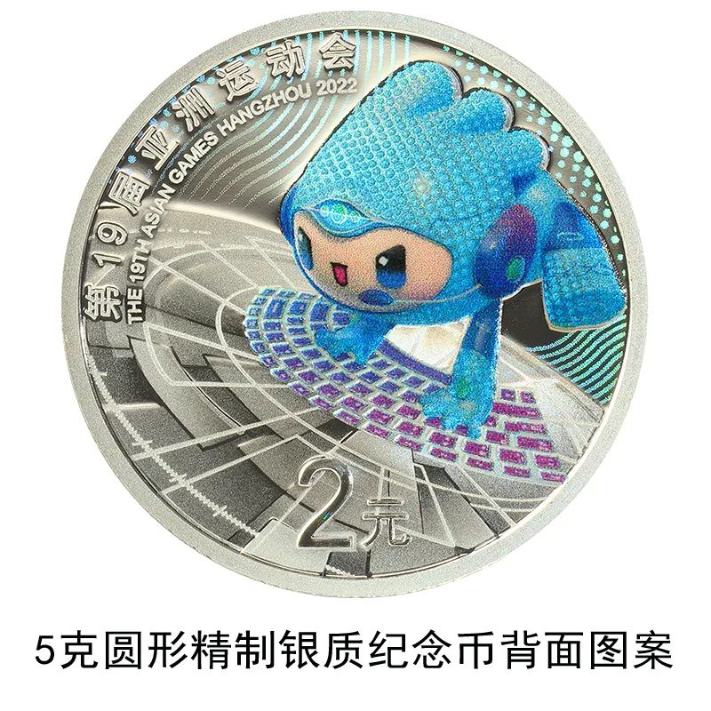 5克圆形银质纪念币背面图案为第19届亚洲运动会吉祥物电子竞技运动造型,辅以互联网科技符号、跑道等元素装饰组合设计,并刊“第19届亚洲运动会”中文字样、“THE 19TH ASIAN GAMES HANGZHOU 2022”英文字样及面额。