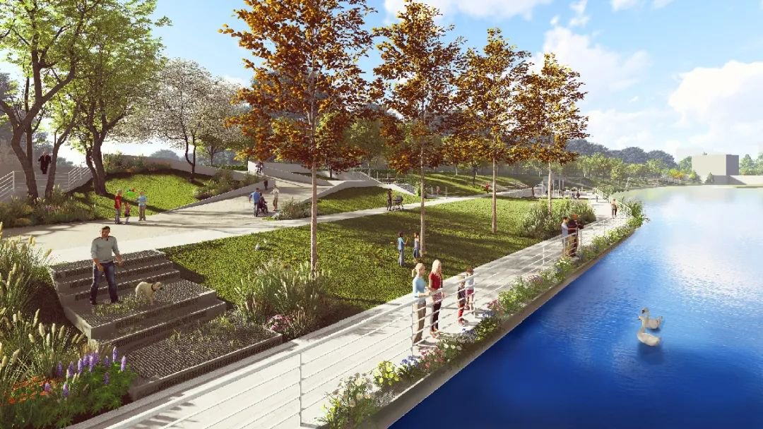串联地块的生态步道系统采用了穿透性强、且利于植物生长的不锈钢网状材质,结合当地木材与石材,尊重生态肌理脉络和可持续发展的前瞻性,体现了城市快速发展同时,让市民感受到九里河这一母亲河孕育城市文明的浓浓人文情怀。