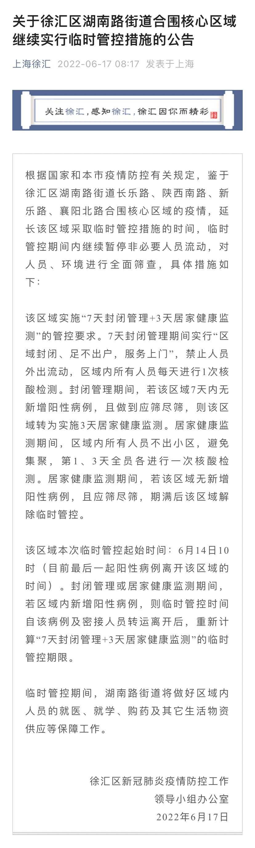 根据国家和本市疫情防控有关规定,鉴于徐汇区湖南路街道长乐路、陕西南路、新乐路、襄阳北路合围核心区域的疫情,延长该区域采取临时管控措施的时间,临时管控期间内继续暂停非必要人员流动,对人员、环境进行全面筛查,具体措施如下: