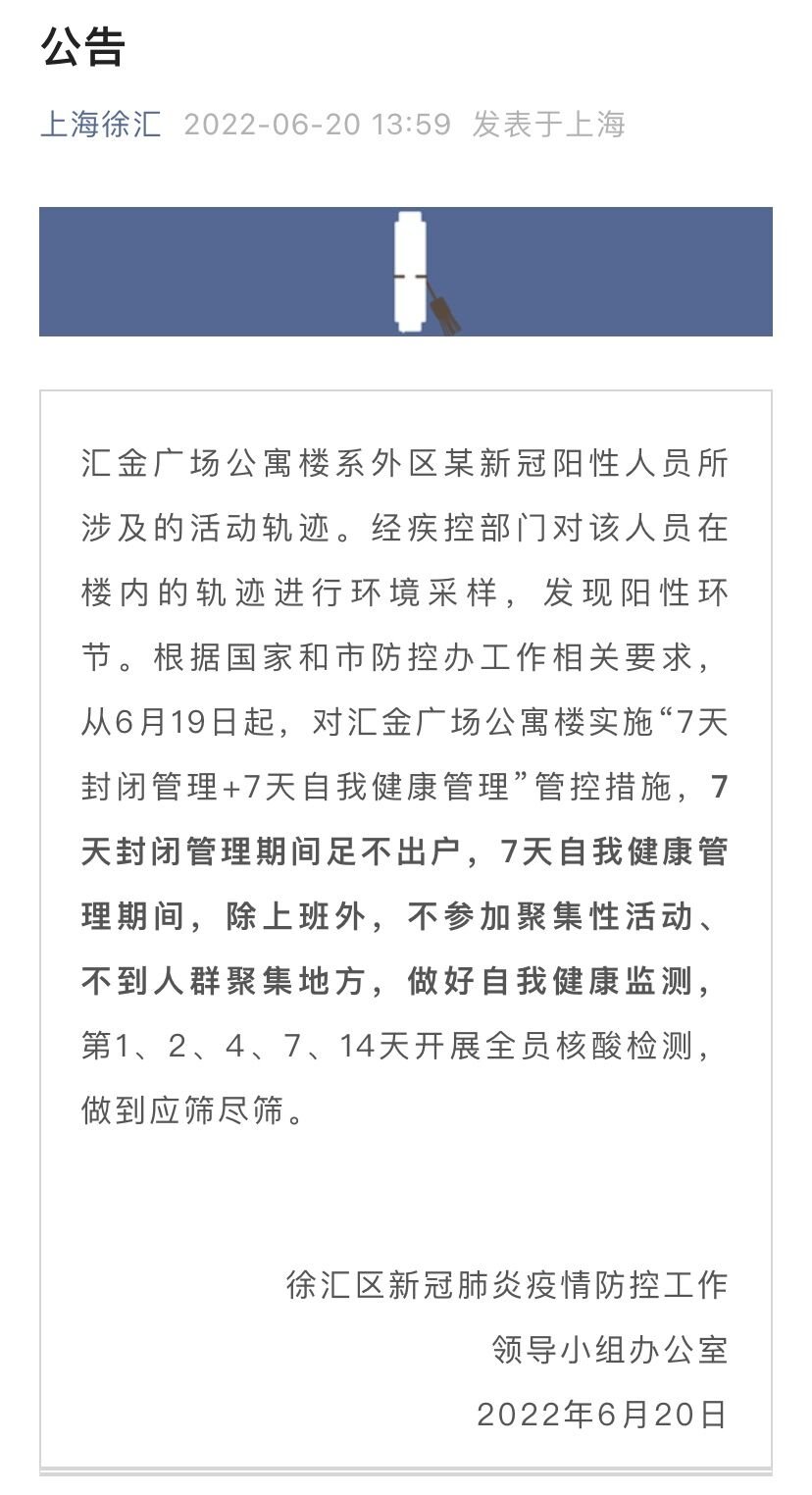 根据国家和市防控办工作相关要求,从6月19日起,对汇金广场公寓楼实施“7天封闭管理+7天自我健康管理”管控措施,7天封闭管理期间足不出户,7天自我健康管理期间,除上班外,不参加聚集性活动、不到人群聚集地方,做好自我健康监测,第1、2、4、7、14天开展全员核酸检测,做到应筛尽筛。