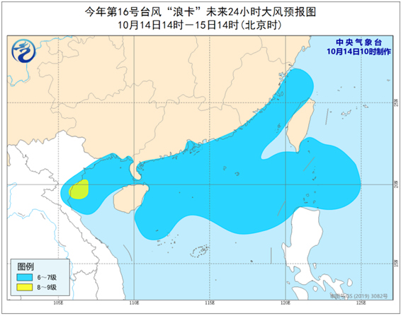 大风预报:14日14时至15日14时,台湾海峡、巴士海峡、南海北部、琼州海峡、北部湾以及福建沿海、广东沿海、广西沿海、海南岛北部沿海将有6-7级大风,其中北部湾西部海域风力可达8-9级、阵风10级。